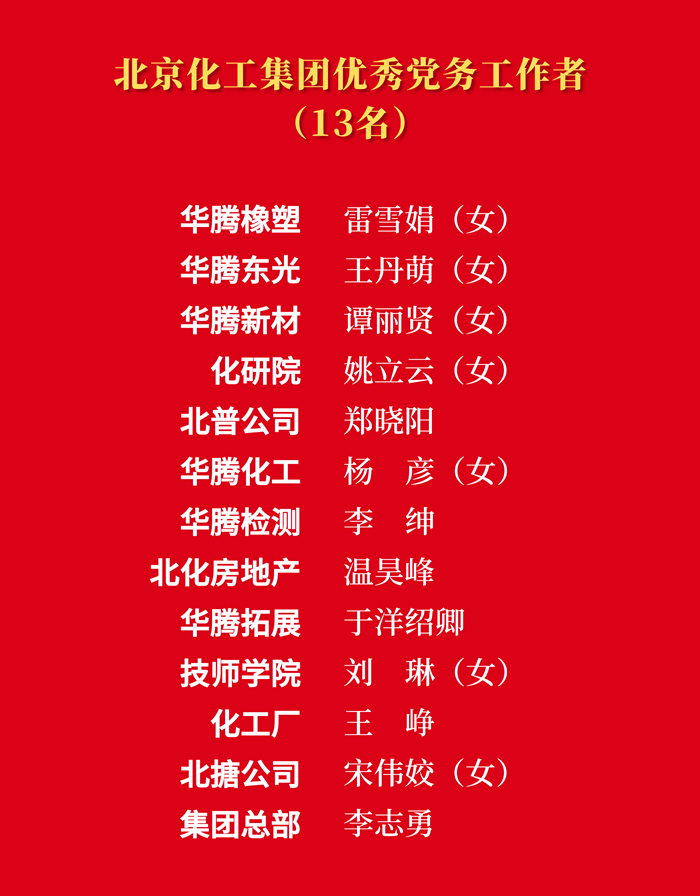 為熱烈慶祝中國共產(chǎn)黨成立103周年,大力表彰在推進(jìn)“十四五”規(guī)劃、推動(dòng)集團(tuán)“231”戰(zhàn)略布局、完成重點(diǎn)工作任務(wù)等各方面涌現(xiàn)出來的先進(jìn)集體和先進(jìn)個(gè)人,市國資委黨委決定,授予北搪黨委“先進(jìn)基層黨組織”稱號(hào),授予技師學(xué)院姜洪強(qiáng)“優(yōu)秀共產(chǎn)黨員”稱號(hào),授予北京化工集團(tuán)總部李志勇“優(yōu)秀黨務(wù)工作者”稱號(hào);北京化工集團(tuán)黨委決定,授予14個(gè)黨支部“先進(jìn)基層黨支部”稱號(hào),授予29名同志“優(yōu)秀共產(chǎn)黨員”稱號(hào),授予13名同志“優(yōu)秀黨務(wù)工作者”稱號(hào)。