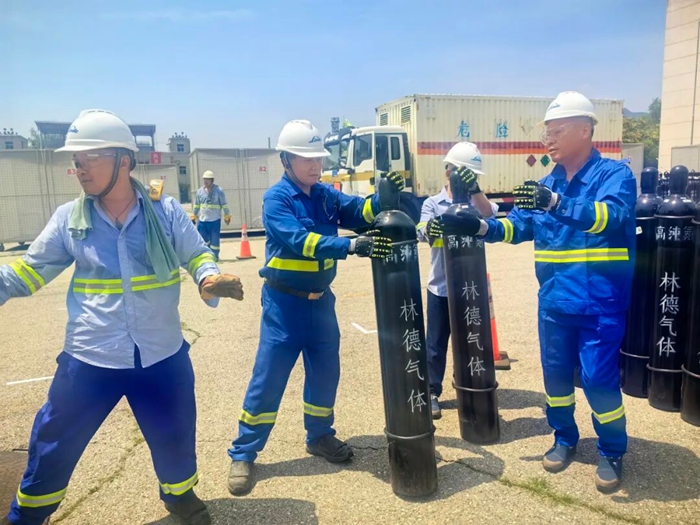 為了在規(guī)定時間完成相關(guān)任務(wù),北普公司將全部人員分成若干工作小組,組長都是由多次參加重大活動保障任務(wù)的老員工擔任,小組的主要任務(wù)是在規(guī)定時間內(nèi)將鋼瓶推放并綁定在指定位置,裝表、聯(lián)管、上槍、調(diào)壓,充氣作業(yè),巡視、加壓、換瓶,一個個規(guī)范動作都責任到小組到個人,目標只有一個,配合協(xié)作單位在規(guī)定時間內(nèi)完成罐裝,以最安全的方式、最快的速度將現(xiàn)場高純氦氣鋼瓶撤出,確保特制移動籠房能夠準時出發(fā)。